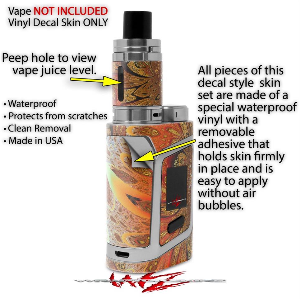 WraptorSkinz® skin wraps are printed using superb photo quality designs and vibrant colors printed with special fade resistant inks that last even in direct sun for years. WraptorSkinz are a composite of two layers of commercial grade materials. The bottom layer is a soft, flexible vinyl with a special removable adhesive that is easily positioned, applied without air bubbles. Next we print the bottom layer with UV protected, fade resistant inks that deliver superb photo quality designs in vibrant colors. Finally we bond a professional grade laminate over the entire skin adding a glossy protective finish. This product is not affiliated with or endorsed by the Smok brand.