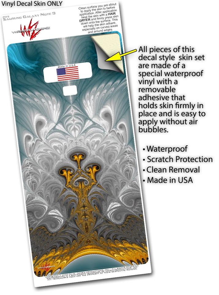 • Decal style vinyl skin covers back and part of the sides of Samsung Galaxy Note 9 - Not a hard case - Fits well with most Clear and TPU cases.