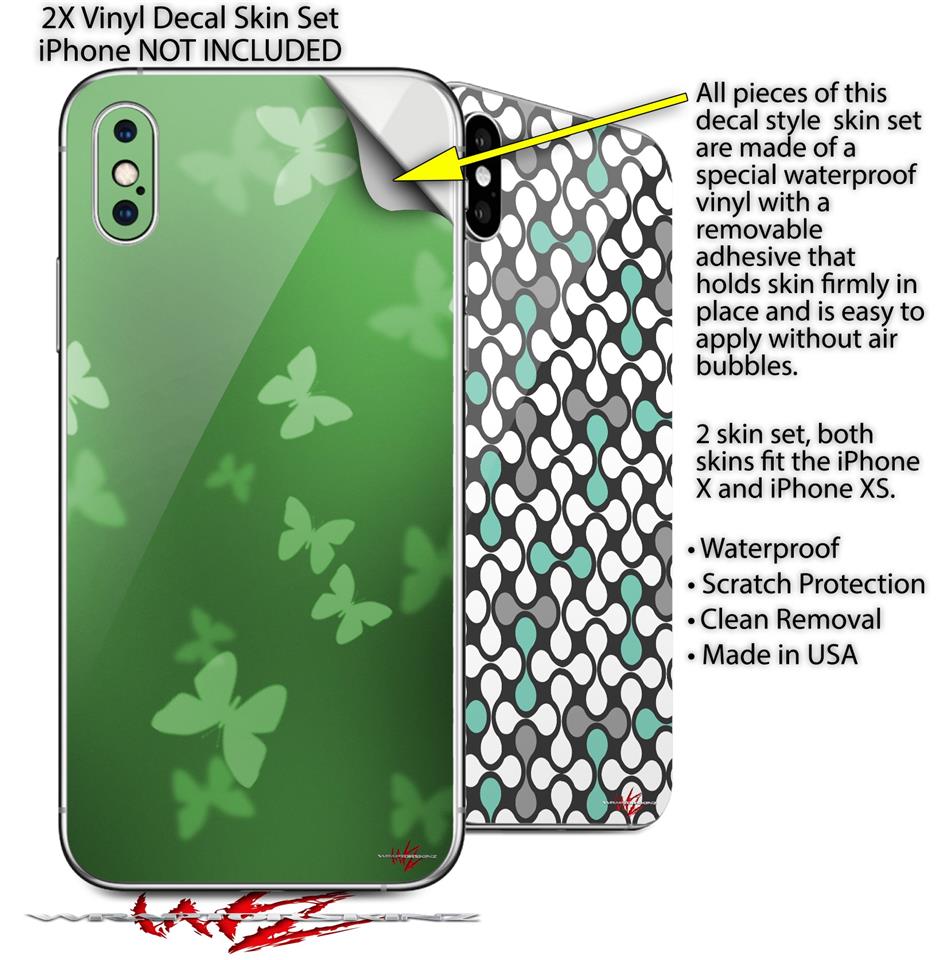2 Decal style Skin Wraps set for Apple iPhone X and XS Bokeh Butterflies Green