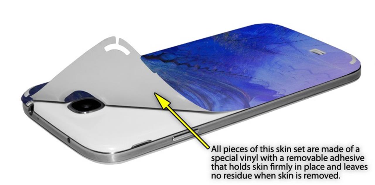 • Decal style vinyl skin covers front and back of Samsung Galaxy S4 phone.