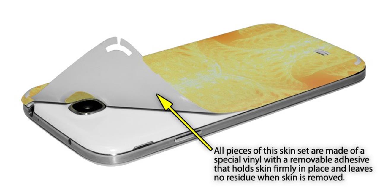 • Decal style vinyl skin covers front and back of Samsung Galaxy S4 phone.