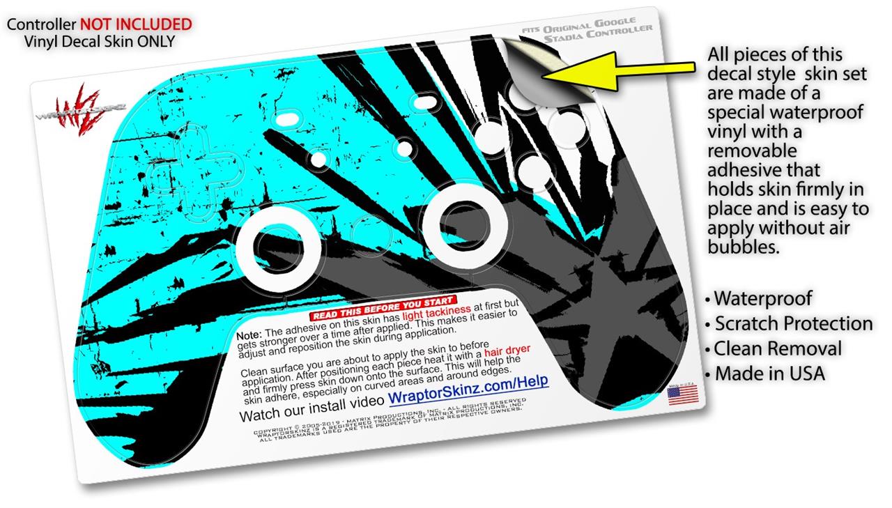 This product is in no way affiliated with or endorsed by Google. WraptorSkinz® skin wraps work with the Original Google Stadia version 1 Controller. Printed using superb photo quality designs and vibrant colors printed with special fade resistant inks that last even in direct sun for years. WraptorSkinz are a composite of two layers of commercial grade materials. The bottom layer is a soft, flexible vinyl with a special removable adhesive that is easily positioned, applied without air bubbles. Next, we print the bottom layer with UV protected, fade resistant inks that deliver superb photo quality designs in vibrant colors. Finally, we bond a professional grade laminate over the entire skin adding a glossy protective finish.