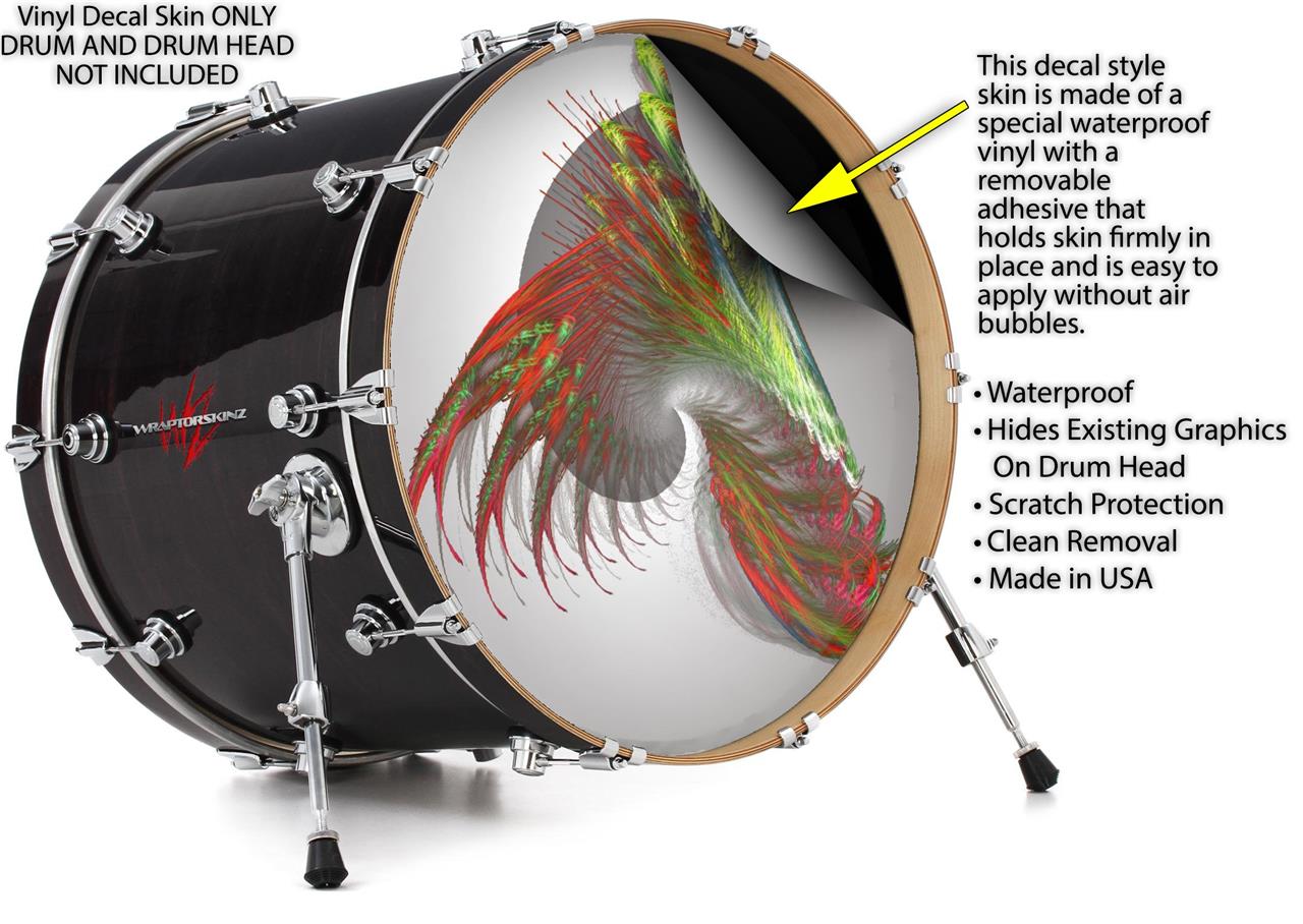 This design also available in other sizes. WraptorSkinz® skin wraps compatible with most kick drum heads. Printed using superb photo quality designs and vibrant colors printed with special fade resistant inks that last even in direct sun for years. WraptorSkinz are a composite three layer commercial grade materials vinyl. The bottom layer is a air release, grey block out removable adhesive that hides existing graphics on the drum head and is easily applied without air bubbles. The middle layer is a flexible vinyl printed with UV protected, fade resistant inks that deliver superb photo quality designs in vibrant colors. Finally, we bond a professional grade laminate over the entire skin adding a glossy protective finish.