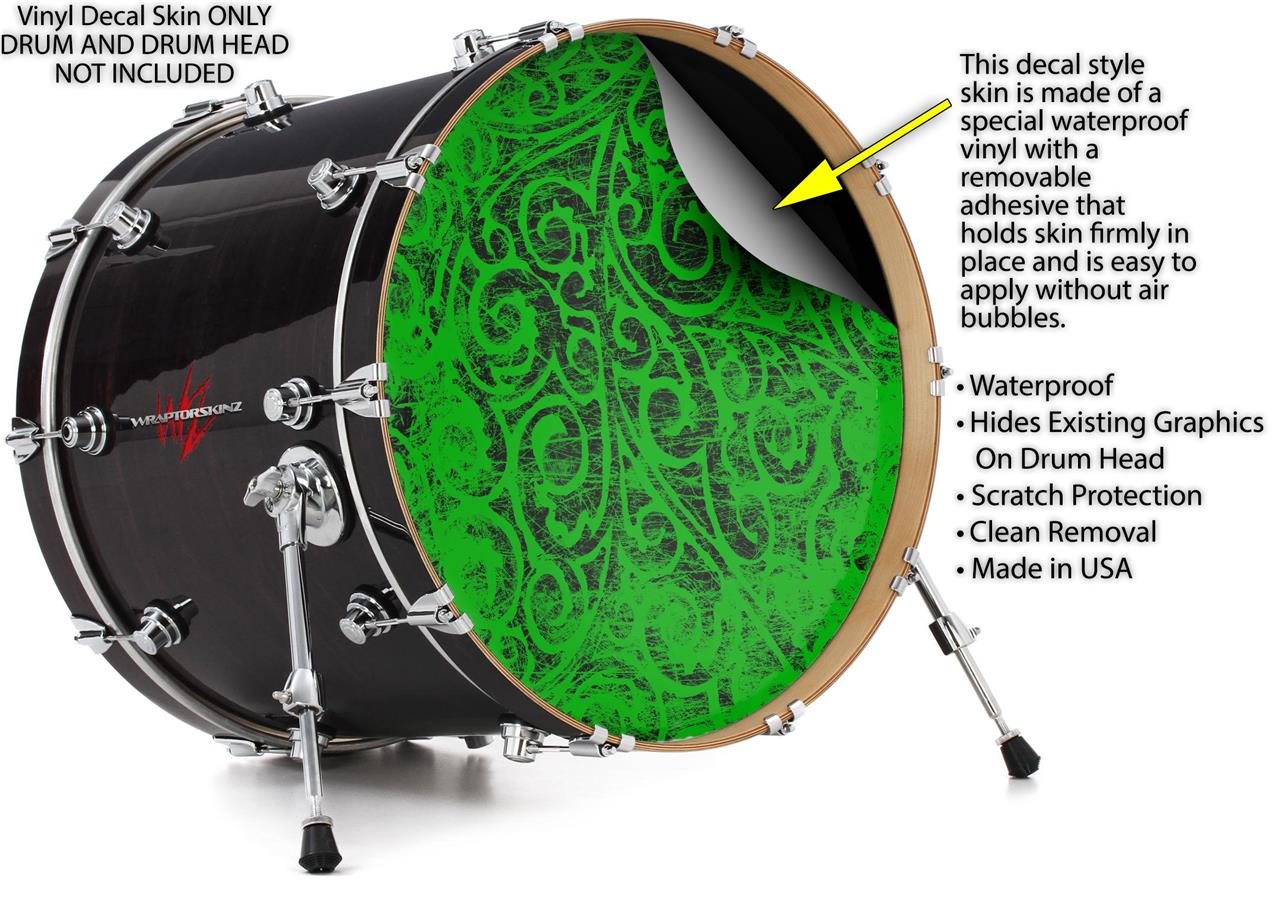 Decal Skin works with most 24" Bass Kick Drum Heads Folder Doodles Green - DRUM HEAD NOT INCLUDED