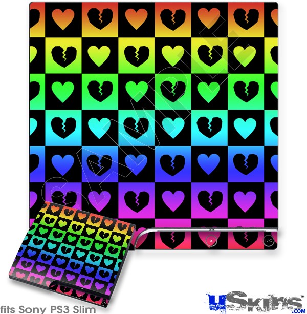 Decal Skin compatible with Sony PS3 Slim Love Heart Checkers Rainbow