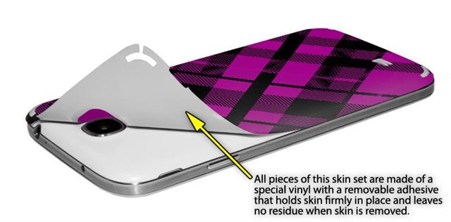• Decal style vinyl skin covers front and back of Samsung Galaxy S4 phone.