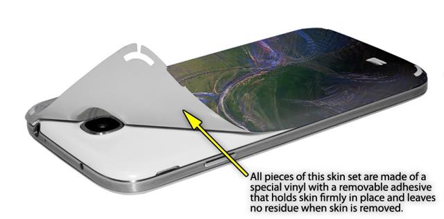 • Decal style vinyl skin covers front and back of Samsung Galaxy S4 phone.