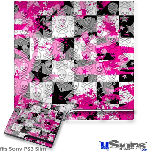 Decal Skin compatible with Sony PS3 Slim Checker Skull Splatter Pink