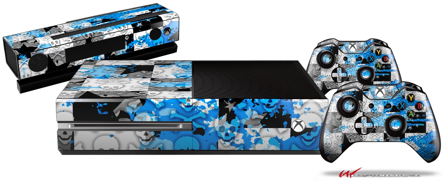 Checker Skull Splatter Blue - Holiday Bundle Decal Style Skin fits XBOX One Console Original, Kinect and 2 Controllers (XBOX SYSTEM NOT INCLUDED)