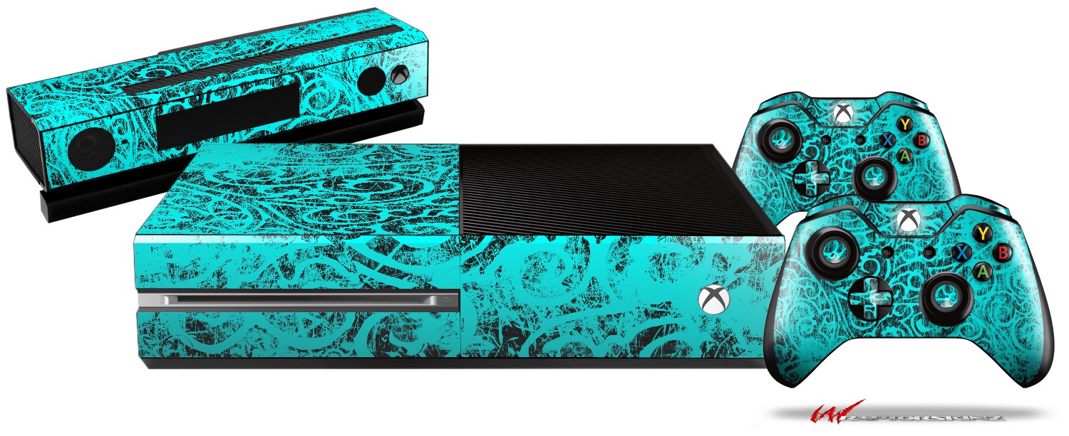 Folder Doodles Neon Teal - Holiday Bundle Decal Style Skin fits XBOX One Console Original, Kinect and 2 Controllers (XBOX SYSTEM NOT INCLUDED)